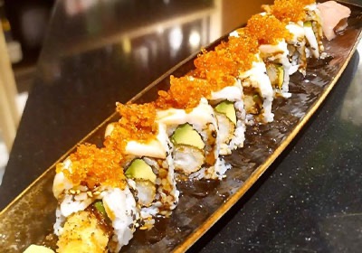 Gambero impanato, capasanta scottata, avocado, sesamo tostato, tobico, teriyaki