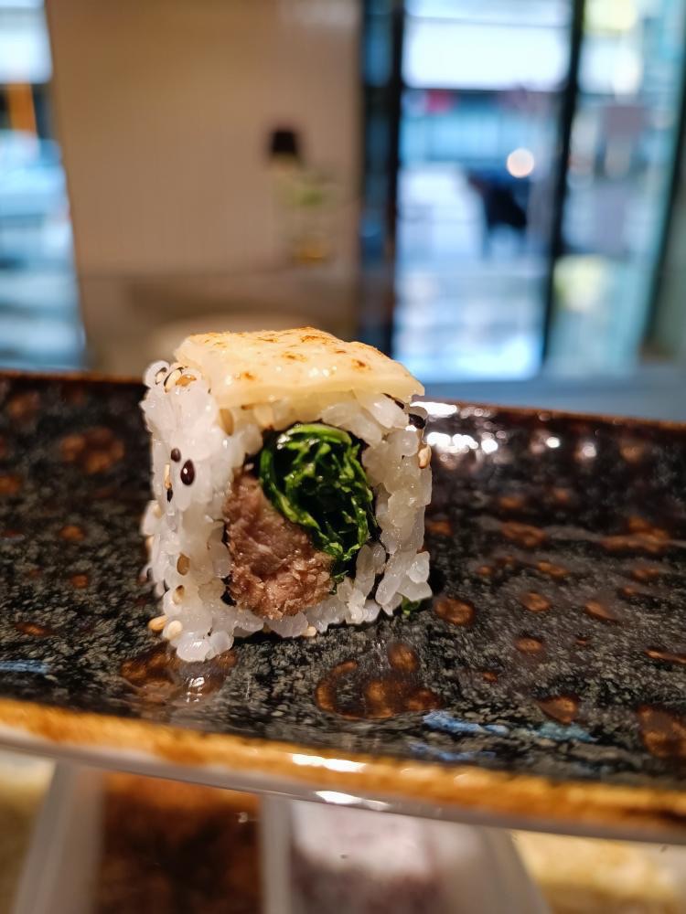 Maiale cotto a bassa temperatura, salsa gize, erba cipollina, rucola, cream cheese, salsa agrodolce, carpaccio di Parmigiano flambato
