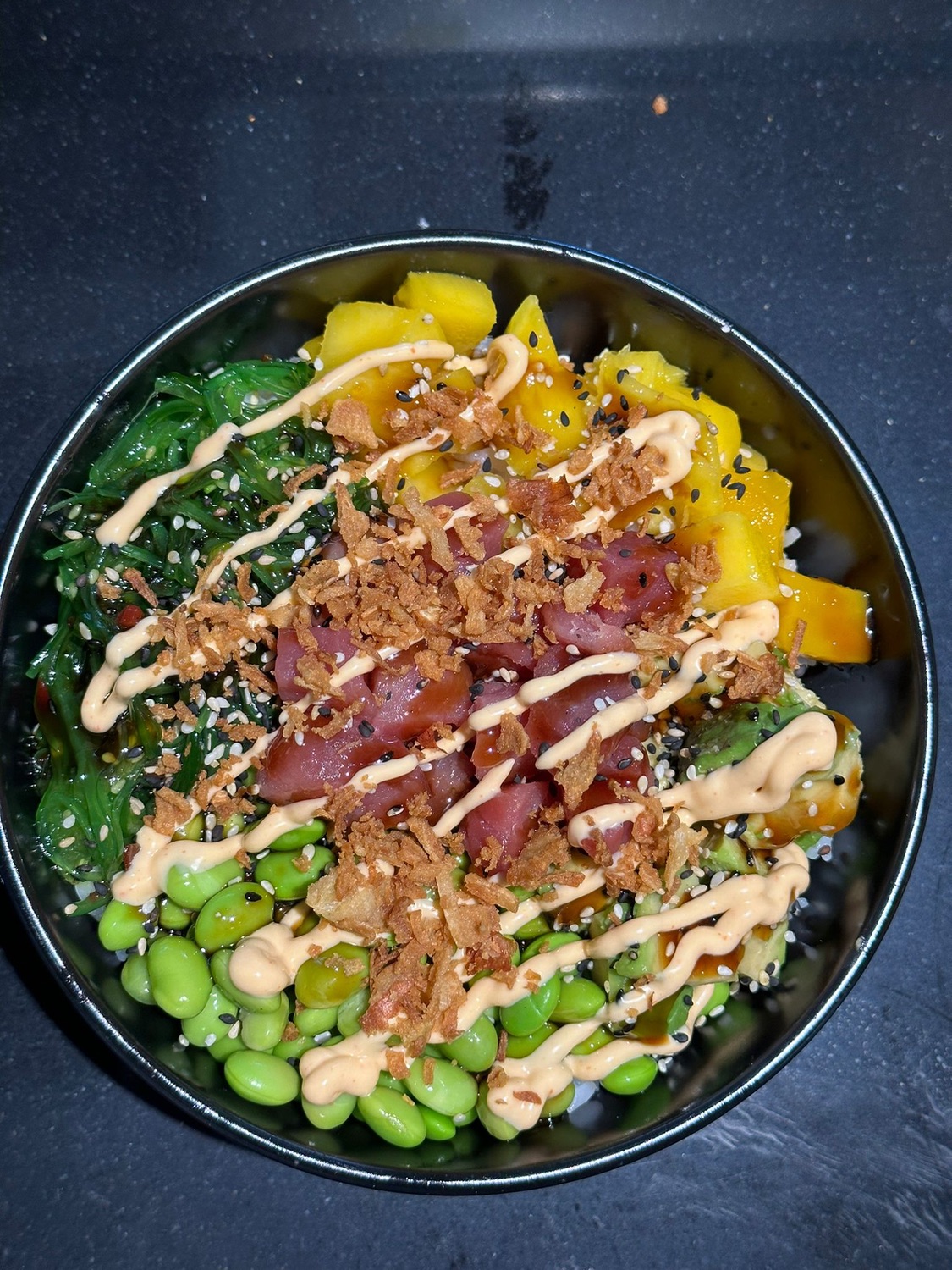 Riso giapponese, tonno, edamame, mango, avocado, wakame, sesamo, teriyaki, maionese spicy, cipolla croccante
